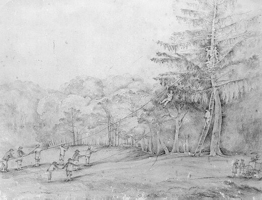Anna Gurney supervising, from her wheelchair, a group of Overstrand fishermen in the use of the Manby life-saving apparatus in the grounds of Northrepps Hall. Copy of a watercolour from a sketch by Hannah Buxton, c.1828.